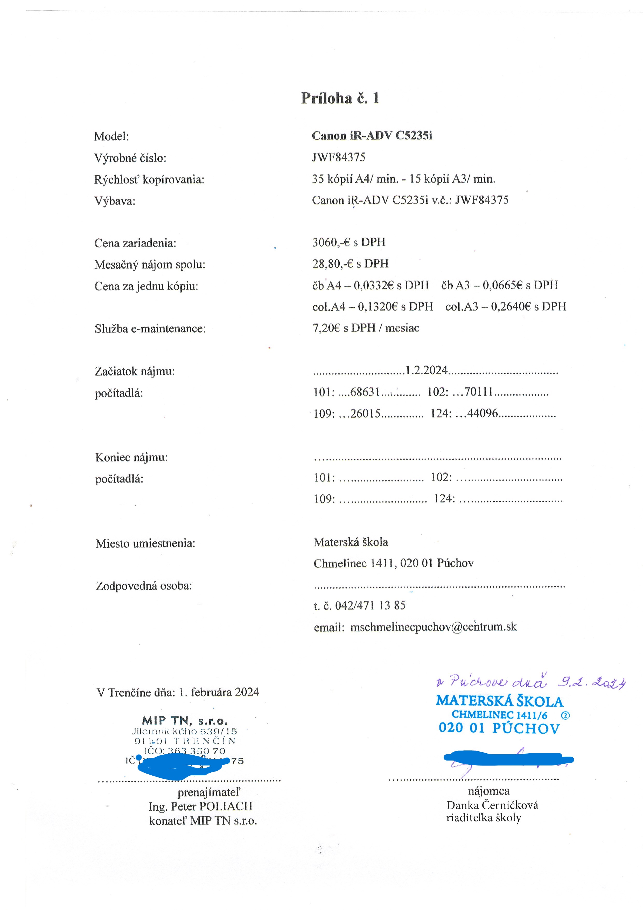 19/2024 | MIP-TN , s.r.o. | MIP -TN - Dodatok č. 1 | Prenájom tlačiarne | 10.02.2024 | 09.02.2024 |
